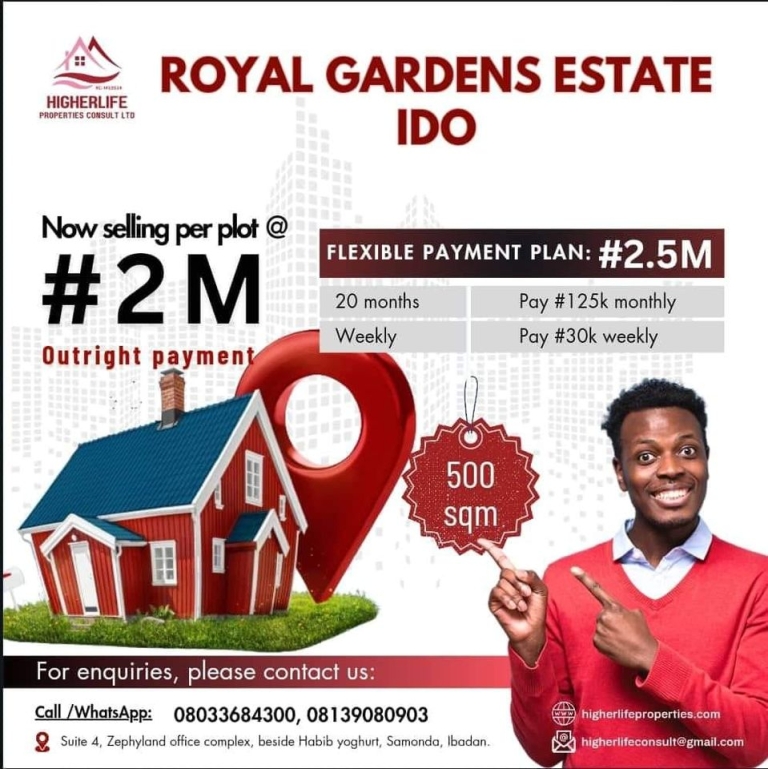 Higher Life Properties Consult Ltd (HPCL), the operator of ROYAL GARDENS IBADAN is a real estate development and investment outfit incorporated and registered as a Liability Company in Nigeria with RC 1453524. The company is focused on improving return on assets, by investing in emerging markets,in Africa especially in Nigeria.